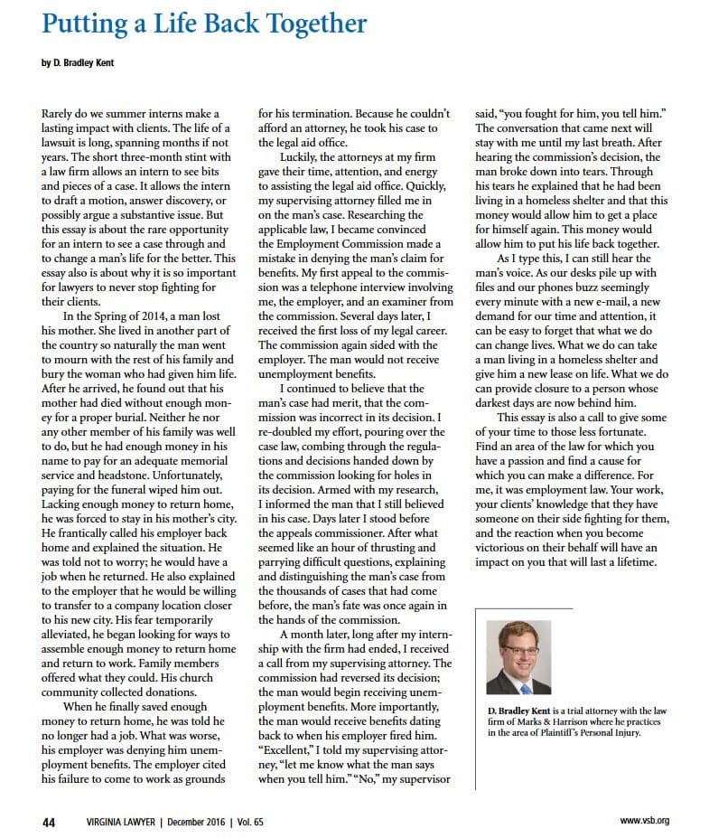 Virginia Lawyer Magazine featured an article written by attorney Brad Kent their December 2016 edition. In the article, Brad discusses his experience with a former client of Marks & Harrison who lost his job and was denied unemployment after taking time off to give his mother a proper burial.